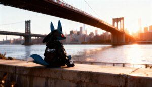 Lucario rolls in wearing Nike and the street bristles: wet asphalt, low-angle shots, cuts on the beat. Clean silhouette, rugged attitude; every frame bites without asking. High-octane editorial made with AI. Unofficial creative piece.